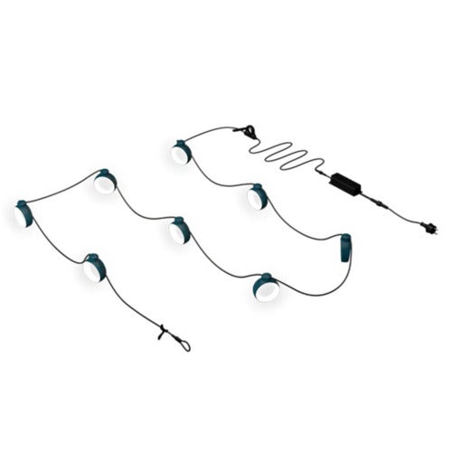 Hoopik-lyssløjfen består af otte lysringe langs et 6 meter langt matsort kabel, der skaber en behagelig atmosfære over bordet, langs facaden eller blandt træernes grene. Med 360° drejelige lysringe i Fermob-farver giver løkken en imponerende "wow!"-effekt, når mørket falder på.