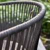 Stolen har sæde og ryg i brede, vævede reb, der både giver behagelig støtte og en håndværksmæssig elegance. Det vævede materiale giver en naturlig fornemmelse og en blødhed, der gør hvert øjeblik ved bordet endnu mere indbydende. For ekstra komfort medfølger der en hynde, så du kan læne dig tilbage og nyde langsomme middage eller hyggelige stunder udendørs.